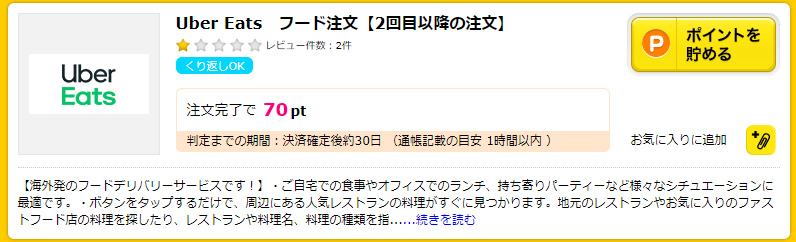 ウーバーイーツの各種割引と関係なく70円分のハピタスポイントが付与されるのでウーバーイーツを使うときはハピタス経由で注文するのがお得です!